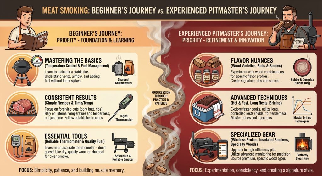 This article outlines the distinct priorities for beginner meat smokers compared to the refined focus of experienced pitmasters. By understanding how priorities shift over time, you can accelerate learning, avoid common pitfalls, and improve results faster.